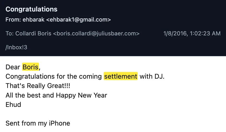Einen Monat später, am 1. Januar 2016, schickte Barak eine Glückwunsch-E-Mail an Collardi zum Vergleich von Julius Bär in einem separaten Steuerhinterziehungsfall des Justizministeriums, in dem die Bank beschuldigt wurde, US-Kunden dabei geholfen zu haben, 600 Millionen Dollar in nicht deklarierten Schweizer Konten zu verstecken – die Bank zahlte fast den gesamten Betrag an die US-Regierung zurück. Barak schrieb Collardi eine begeisterte Nachricht: „Das ist wirklich großartig!!!“ Epstein schickte Barak eine Kopie der zivilrechtlichen Einziehungsforderung des Justizministeriums, in der Julius Bär aufgefordert wurde, 220 Millionen Dollar zu zahlen. Collardi reagierte nicht auf die Bitte von Drop Site um eine Stellungnahme.