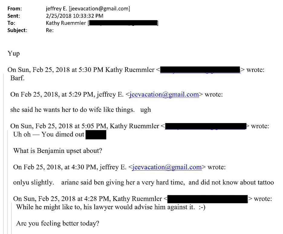 Aus den Offenlegungen des Repräsentantenhauses geht hervor, dass Epstein und de Rothschild in den Jahren vor Epsteins Tod weiterhin eng miteinander verbunden waren. In einem E-Mail-Austausch mit der ehemaligen Rechtsberaterin von Obama im Weißen Haus, Kathryn Ruemmler, im Jahr 2018 tratschte Epstein über die Eheprobleme von de Rothschild mit Benjamin de Rothschild, dem Erben des Rothschild-Vermögens. Er schrieb an Ruemmler: „Ariane sagte, Ben mache ihr das Leben sehr schwer und wisse nichts von der Tätowierung … Sie sagte, er wolle, dass sie sich wie eine Ehefrau verhalte. Ugh.” Ruemmler antwortete: „Kotz.”