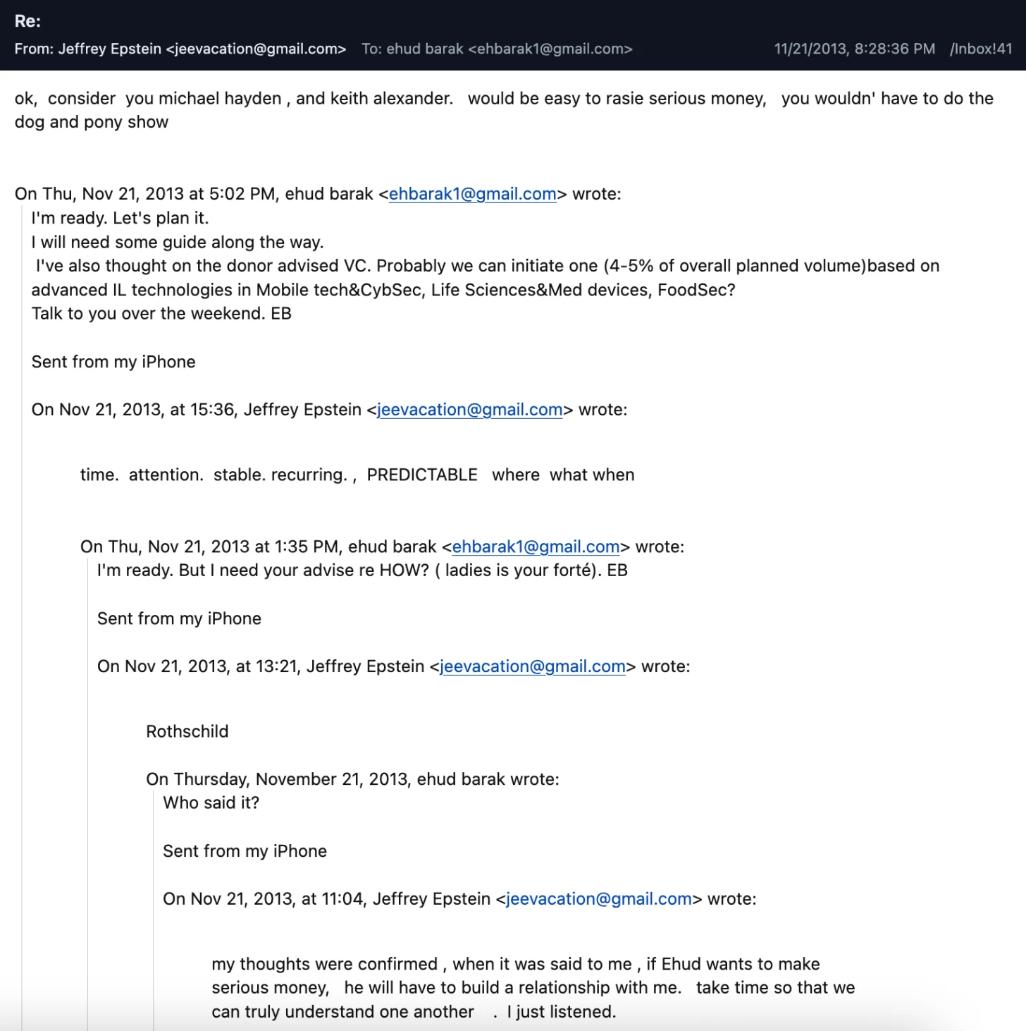Epstein versicherte Barak, dass er in guter Gesellschaft mit ehemaligen US-Militärführern sei, die eine lukrative Karriere mit dem Verkauf von Cybersicherheitsprodukten im Zusammenhang mit Geheimdienstinformationen machten: dem ehemaligen NSA- und CIA-Direktor Michael Hayden und dem US-Cyberkommandeur Keith Alexander. Er schrieb: „Ok, denken Sie an Michael Hayden und Keith Alexander. Es wäre einfach, viel Geld aufzutreiben, Sie müssten keine Show abziehen.“