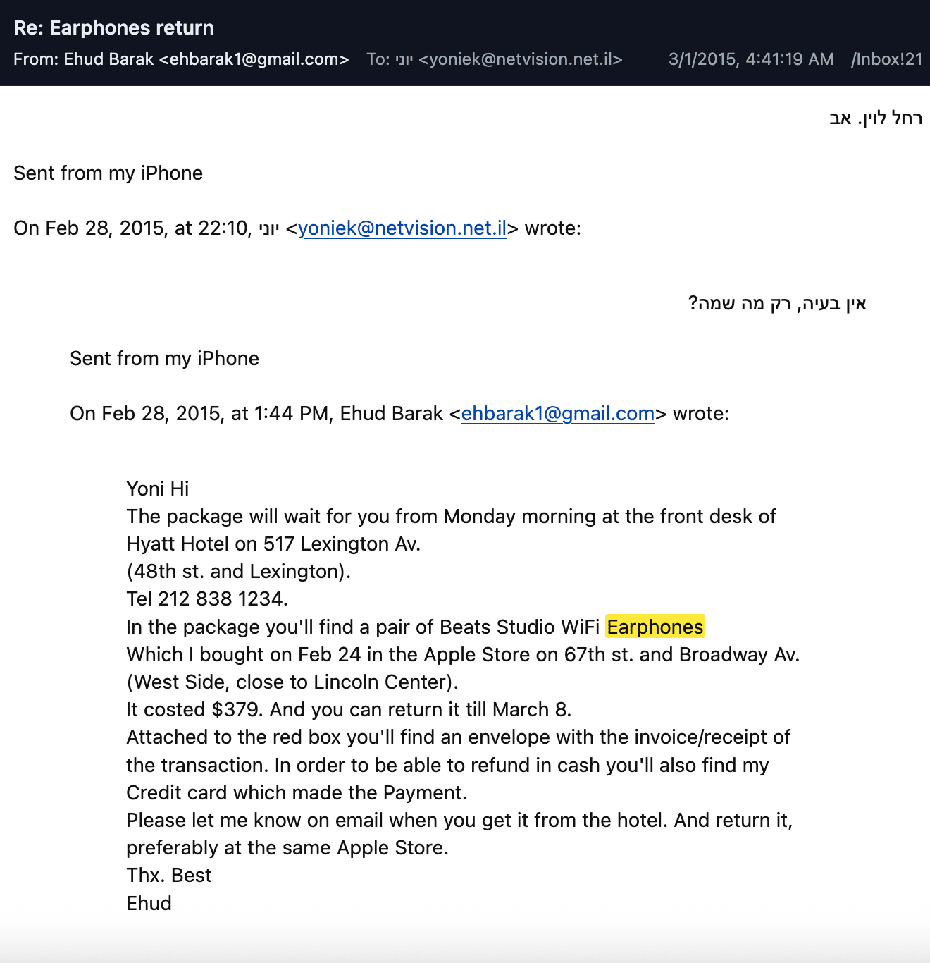 Laut der E-Mail kaufte Barak am 24. Februar, einen Tag nachdem er Epstein die Bankdaten geschickt hatte, rote „Beats by Dre”-Kopfhörer. Barak wies Yoni an, ein Paket mit den Kopfhörern im Hotel abzuholen und sie in einem Apple Store in der Upper West Side zurückzugeben. Laut Baraks Nachricht war dem Paket ein Umschlag mit einer Quittung und einer Bankkarte beigefügt. Barak schrieb an Koren: „Um eine Rückerstattung in bar zu erhalten, benötigen Sie die Karte. Schicken Sie mir eine E-Mail, wenn Sie sie abgeholt haben.”