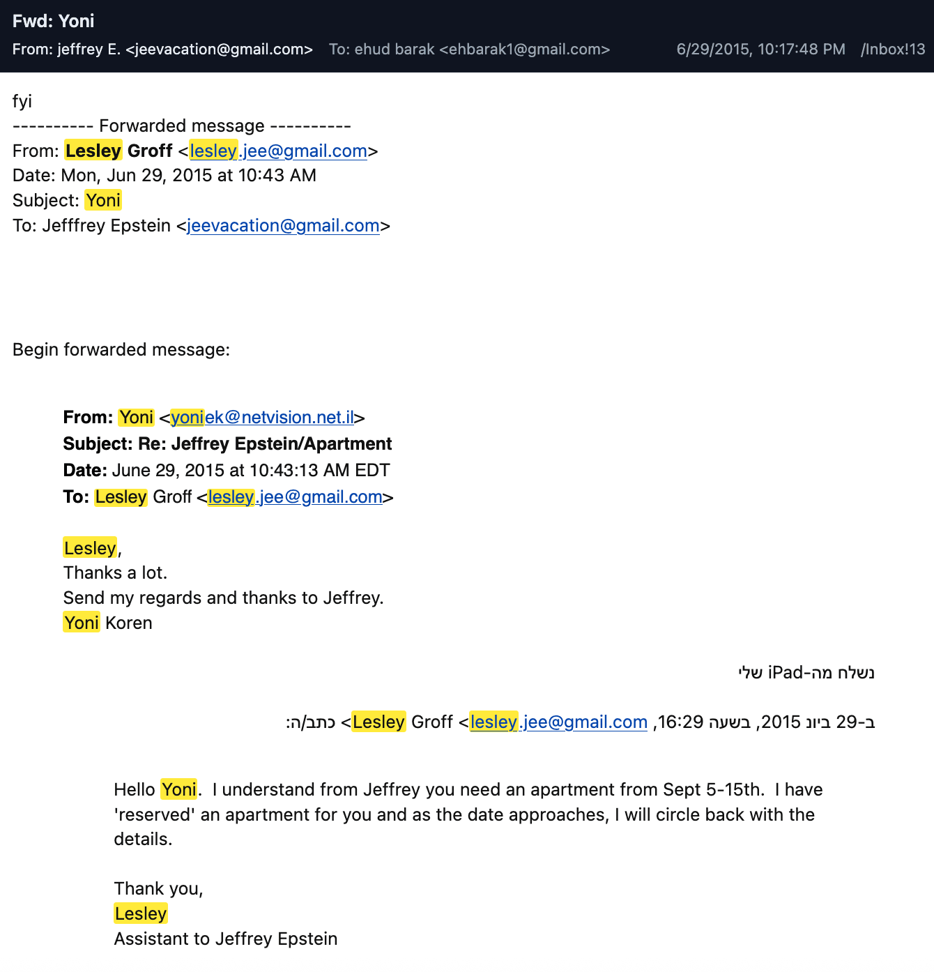 Koren schien Baraks Bitte sofort zu verstehen und stimmte zu. Er schrieb auf Hebräisch zurück: „Kein Problem, wie heißt sie?“ Barak antwortete mit einem Frauennamen: „Rachel Levin.“ Dieser Name taucht sonst nirgendwo in Baraks E-Mails auf, und es ist unklar, auf wen oder was er sich bezog.