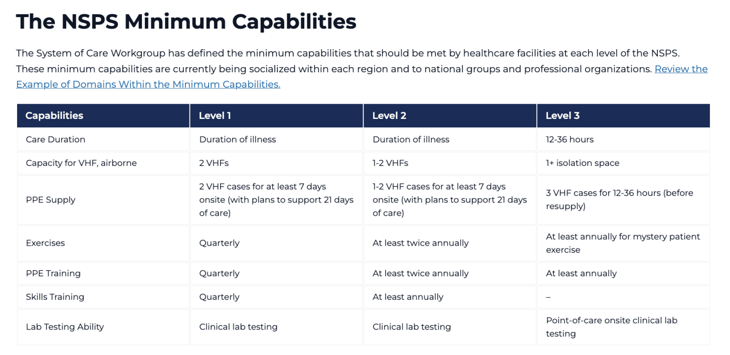 „Unter der Leitung der ASPR vergibt NETEC nun Fördermittel in Höhe von 37.500.000 US-Dollar an 75 Einrichtungen (500.000 US-Dollar pro Einrichtung), damit diese die Anforderungen für NSPS-Level-2-Einrichtungen erfüllen können. Die Mittel werden Aktivitäten unterstützen wie die Schulung des Gesundheitspersonals, die Verbesserung der Infrastruktur und die Beschaffung von spezieller Ausrüstung, um sicherzustellen, dass die Level-2-Einrichtungen die Mindestanforderungen des NSPS erfüllen. Es wird erwartet, dass diese Bemühungen letztendlich zur Zertifizierung der geförderten Einrichtungen als Level-2-SPTCs führen. Diese Erweiterung verbessert erheblich die nationale Kapazität zur Bewältigung von Ausbrüchen und die geografische Reichweite für die Behandlung von HCIDs.“