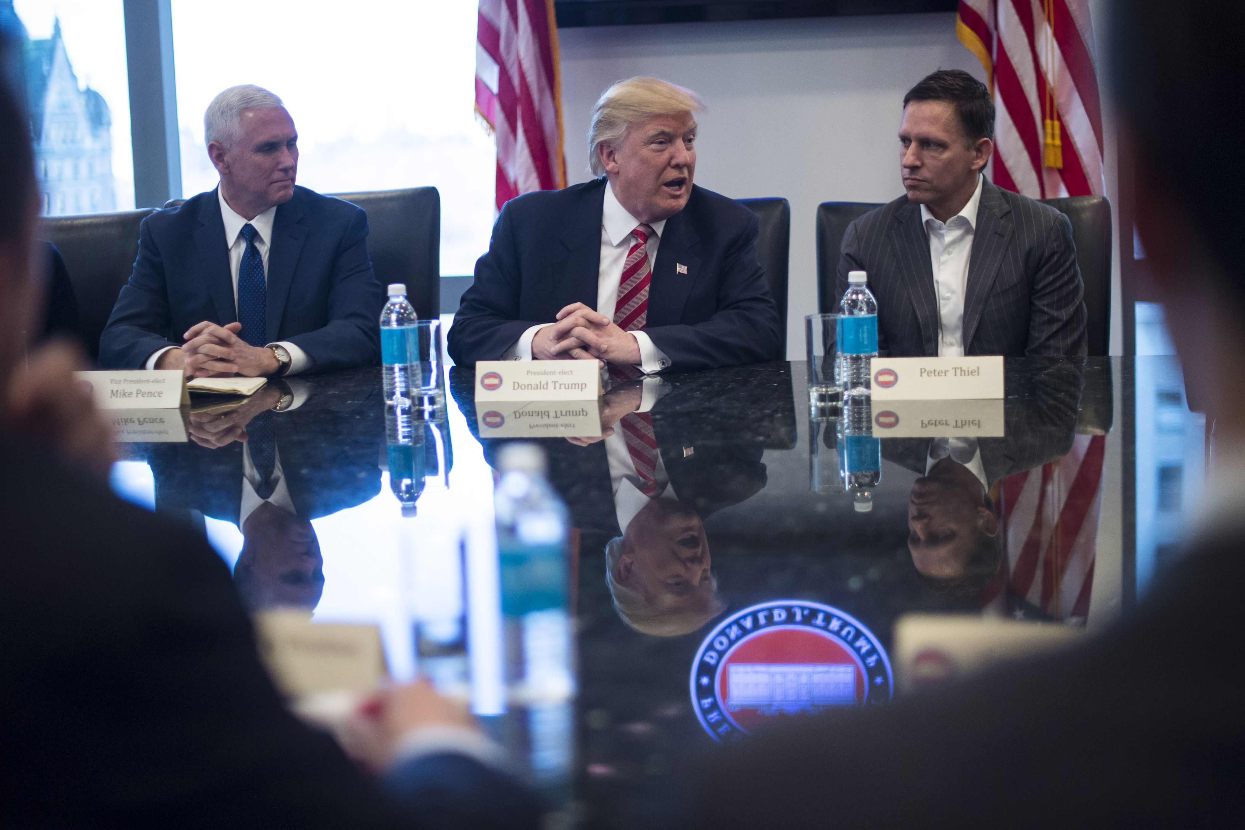 Der designierte Vizepräsident Mike Pence (links) und PayPal-Gründer Peter Thiel hören dem designierten Präsidenten Donald Trump während eines Treffens mit führenden Vertretern der Technologiebranche im Trump Tower in New York im Jahr 2016 zu. © Jabin Botsford/The Washington Post