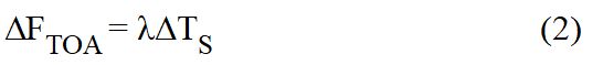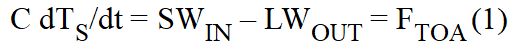 In Gl. 1 ist C die effektive Wärmekapazität pro Fläche des Systems Erde und T eine für das System charakteristische Temperatur. In der Praxis wird die Temperatur TS aus offensichtlichen Gründen als die charakteristische Klimatemperatur betrachtet. Im Gleichgewichtszustand ist ∂TS/∂t = FTOA = 0.