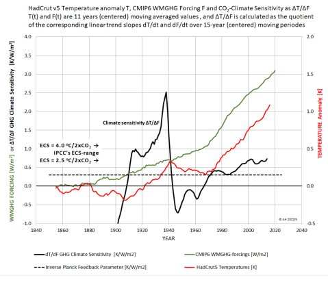 Diese Suche begann mit einer Art „Reverse Engineering“ meines CMC [4] unter Verwendung der gleichen Daten, TS von HadCrut5 [7], dem Treibhausgasantrieb FGHG von NASA/GISS [6] und der Berechnung der Klimasensitivität als ̶ 1/λ = ∆TS/∆FGHG (siehe Gl.3 weiter unten) über das letzte Jahrhundert. Um diese Sensitivität als guten Näherungswert für die Gleichgewichts-Klimasensitivität ECS zu verwenden, wurden lange Zeiträume von 15 Jahren zur Bestimmung der durchschnittlichen Steigungen von TS(t) und FGHG(t) verwendet. Die Ergebnisse sind in Abb. 1 dargestellt, aber angesichts der kleinen ∆FGHG-Werte vor etwa 1920 sollte man die Werte vor diesem Zeitpunkt nicht allzu ernst nehmen.
