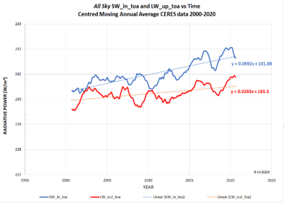 In Abb.2 sind die Werte für SWIN und LWOUT an der TOA für den Zeitraum 2000-2020 aufgetragen. Es handelt sich um gleitende Jahresmittelwerte, um alle kurzfristigen Schwankungen zu unterdrücken. Dennoch sind sie immer noch recht „schwankend“, aber ihre Trends scheinen stabil zu sein und im Durchschnitt nach oben zu gehen. Ihre absoluten Werte können hinsichtlich ihrer Genauigkeit in Frage gestellt werden, aber ich brauche nur ihre viel zuverlässigeren Steigungen.