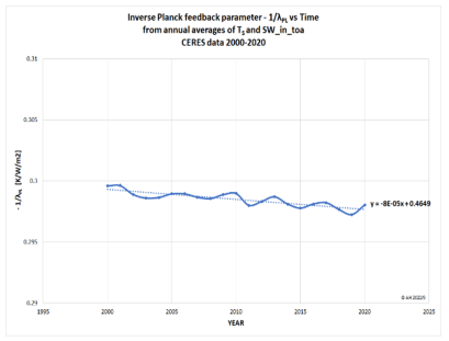 Wir können auch die „Stabilität“ des Planck-Rückkopplungsparameters betrachten und sehen, wie sich dieser Wert im Laufe der Zeit entwickelt. In Abb. 3 ist -1/λPL in Abhängigkeit von der Zeit aufgetragen, wie durch Gleichung 4 aus den Werten der CERES-Daten berechnet. Um das Rauschen zu unterdrücken, werden jährliche Durchschnittswerte verwendet, um den Wert 1/(4SWIN/TS) über den Zeitraum 2000-2020 zu berechnen. Abb. 3 verdeutlicht sofort die hohe Stabilität dieser Klimasensitivität (man beachte die Skala) mit weniger als 0,2 % Veränderung über 20 Jahre. Darüber hinaus ist sie rückläufig, was im Gegensatz zu dem steht, was man von einem verstärkten Erwärmungseffekt einer hohen ECS mit großen Rückkopplungen erwarten kann.
