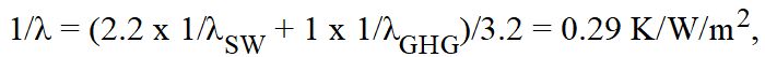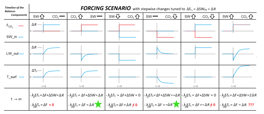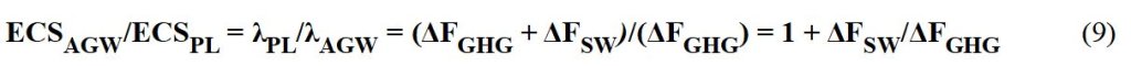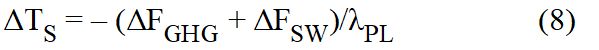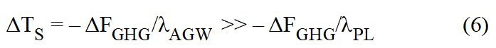 Die Ungleichung in Gl. 6 kann auch durch Änderung von ΔF wiederhergestellt werden, wobei λAGW = λPL bleibt. Nehmen wir einfach einen weiteren Antrieb ΔFSW neben dem Treibhausgasantrieb ΔFGHG an, wie ich es intuitiv bei der Analyse der Wolkeneffekte getan habe [3]: