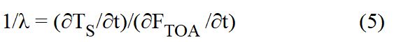 Ich werde nicht alle Schritte wiederholen, die man in jedem Lehrbuch der Klimawissenschaften finden kann, sondern lediglich die wichtigste Formel angeben, die sich aus Gl. 1 ableitet, wobei ich von der allgemeinen Annahme ausgehe, dass die Änderungen des Strahlungsflusses an der TOA proportional zu den Änderungen der Temperatur sind: