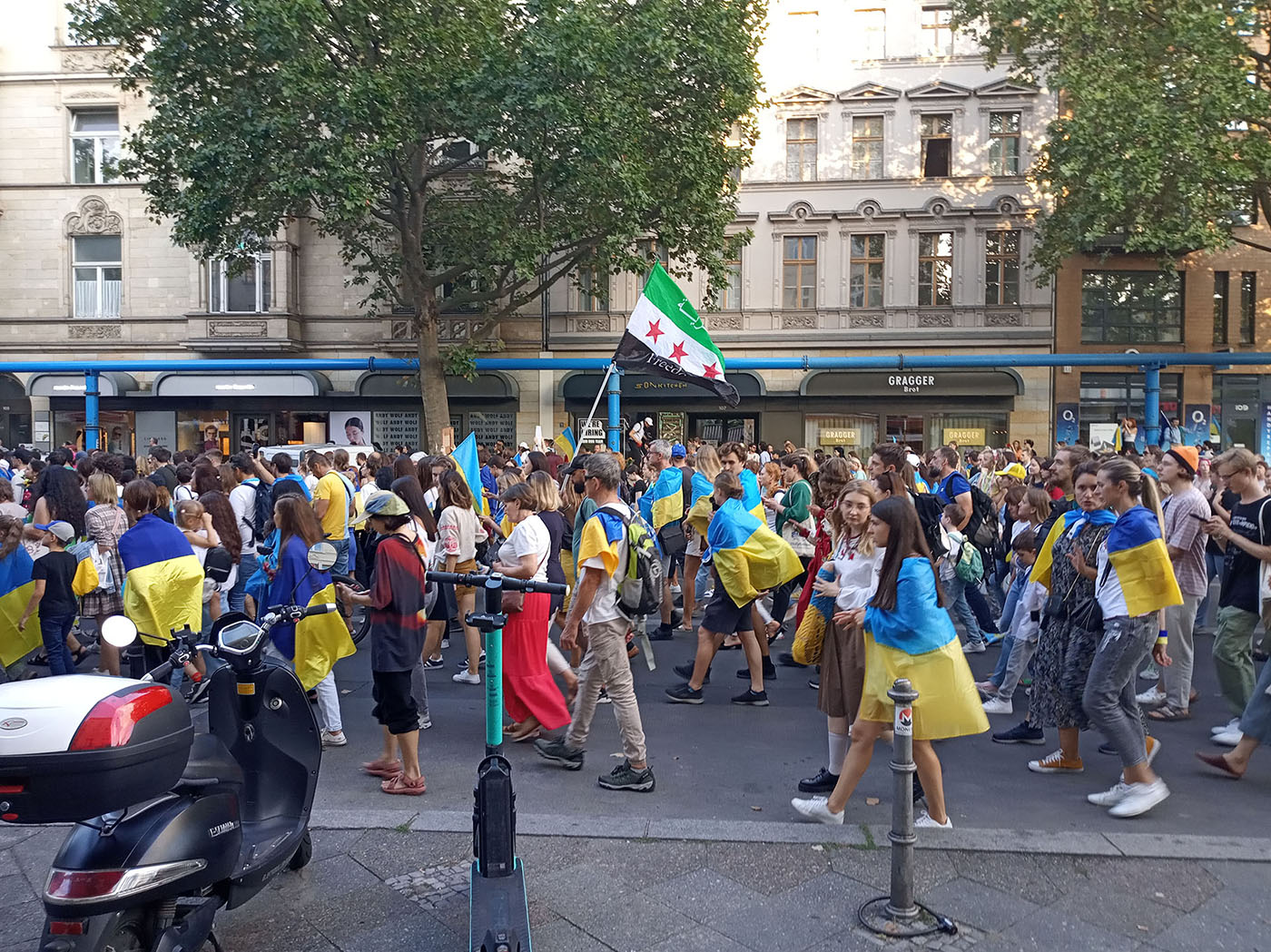 Stau in der Stadt. Ziemlich groß und stabil, alles am frühen Abend. Mit dem Auto muss man um den Potse rumfahren, weit und weiter, um dann vielleicht mal am Gleisdreieck die Richtung ändern zu können. Der Grund: Eine große Demonstration von ukrainischen und anderen Menschen auf der Potsdamer Straße. Im optischen Gegenbild: Das Russische Kulturzentrum an der Friedrichstraße sieht aus wie ein eingemottetes Schlachtschiff. Die Botschaft der Russischen Föderation unter den Linden dito.