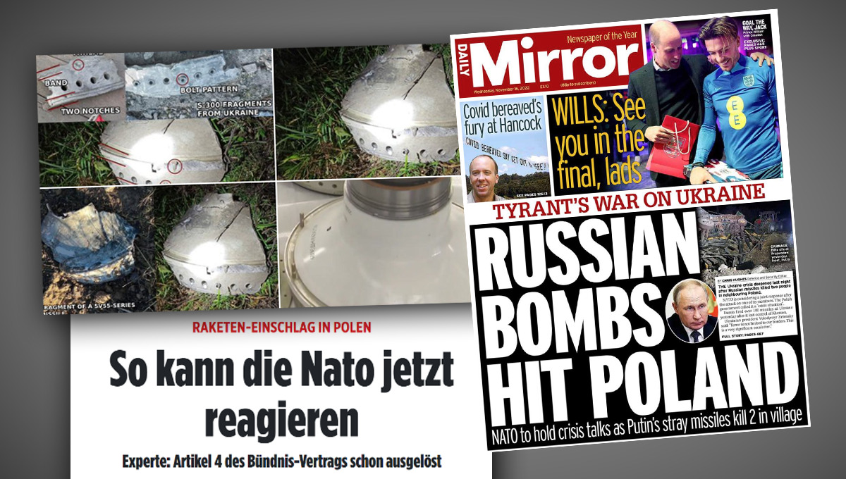 Am Abend des 15. Novembers sollen russische Raketen die polnische Stadt Przewodów nahe der ukrainischen Grenze getroffen haben. Sollte sich herausstellen, dass es sich tatsächlich um russische Raketen gehandelt hat, könnte man dies im NATO-Land Polen als kriegerischen Akt werten. Ein US-amerikanischer Geheimdienstoffizier habe die russische Herkunft gegenüber der Nachrichtenagentur AP bereits bestätigt.