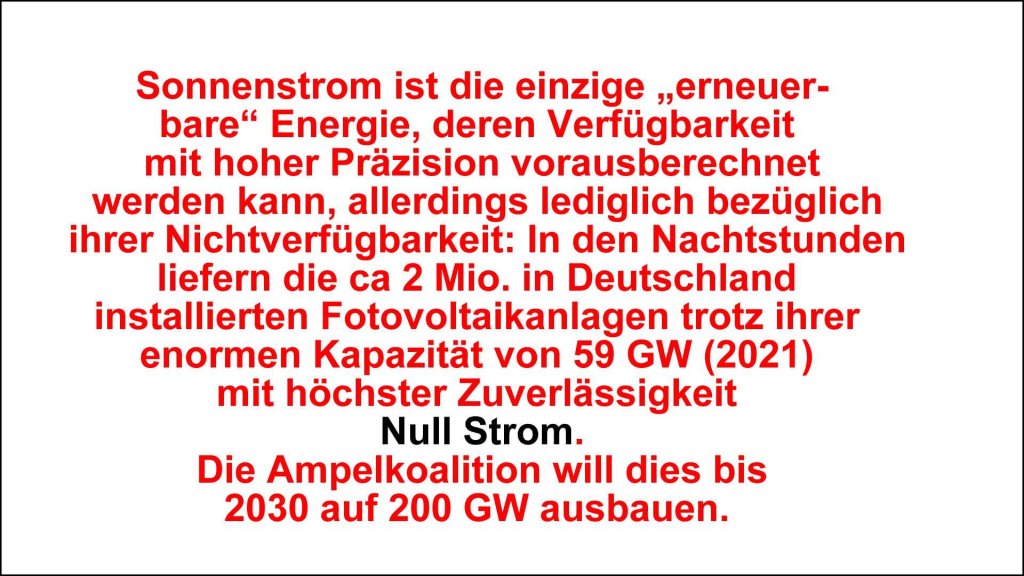 Bild 4. Bis 2030 soll laut Koalitionsvertrag der Ampel-Parteien allein schon die im Winter so gut wie nutzlose Fotovoltaik auf 200 GW ausgebaut werden (Bild: Autor)