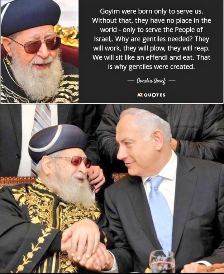 „Nichtjuden wurden nur geboren, um uns zu dienen. Ohne das haben sie keinen Platz in der Welt – nur um dem Volk Israel zu dienen. Wozu braucht man Nichtjuden? Sie werden arbeiten, sie werden pflügen, sie werden ernten. Wir werden faul herumsitzen und essen. Dafür wurden Nichtjuden geschaffen.“