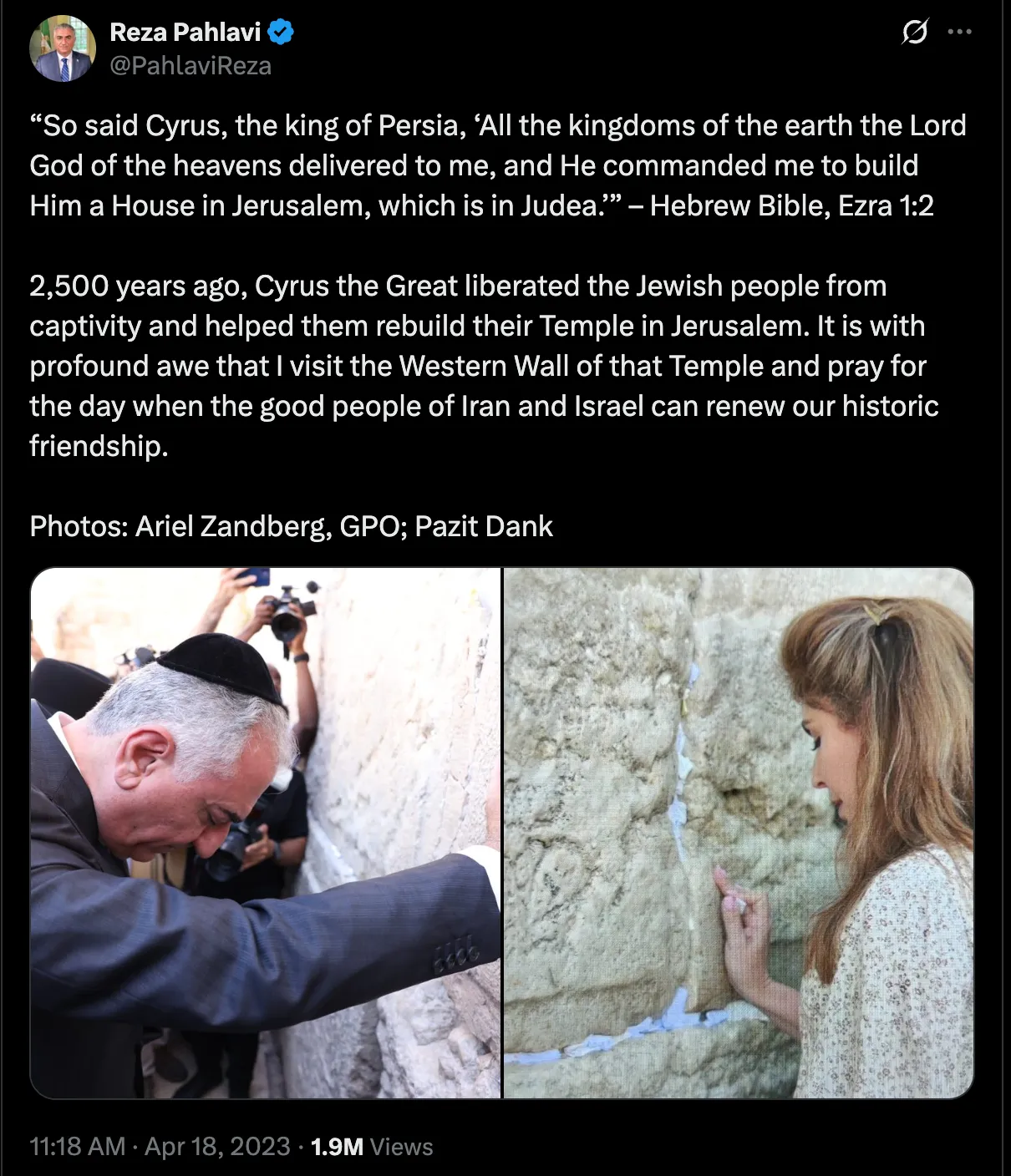 Wenn das Volk für die Wiedereinführung der Monarchie stimmt, könnte Pavlavi als neuer Schah die alte Freundschaft zwischen dem Iran und Israel wiederbeleben und wie ein moderner Erbe von Kyros dem Großen seinen Segen für den Bau des Dritten Tempels in Jerusalem geben.