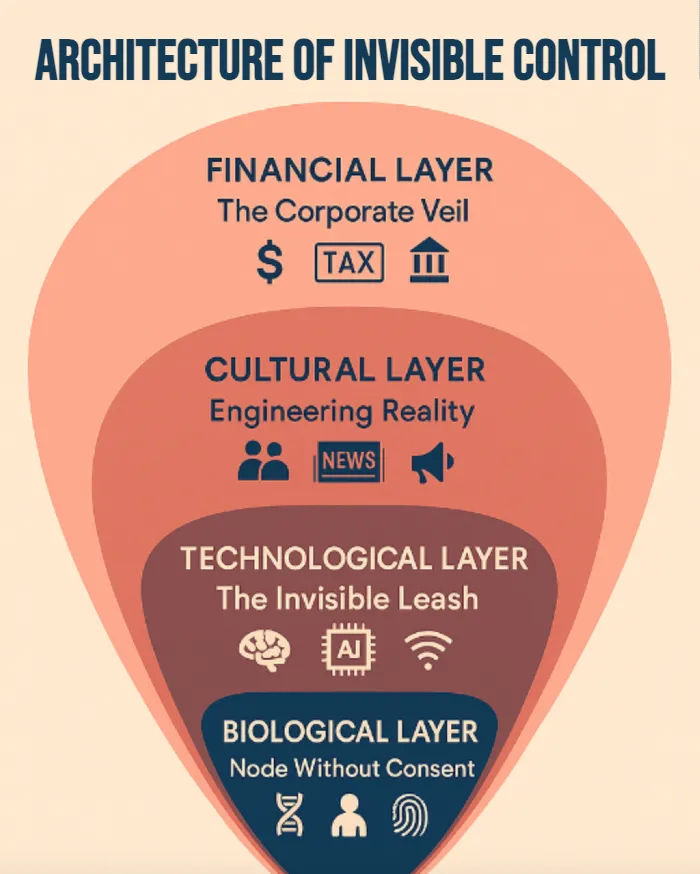 Dies stellt die perfekte Synthese meiner bisherigen Untersuchungen dar: die rechtliche Umwandlung des Corporate Veil, die den Rahmen für die Behandlung von Bürgern als Unternehmensvermögen schuf, der technologische Apparat, der die Liefermechanismen perfektionierte, und die biologische Kolonisierung, die die letzte Grundlage für die Kontrolle bildete.