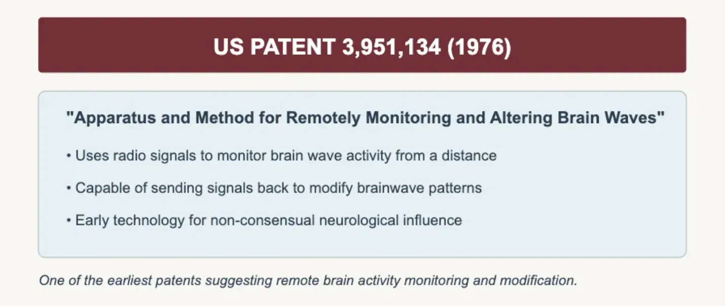 US-Patent 3.951.134: Fernüberwachung und Veränderung von Gehirnwellen. Man muss das Gerät nicht einmal tragen. Die Umgebung selbst wird zur Waffe.