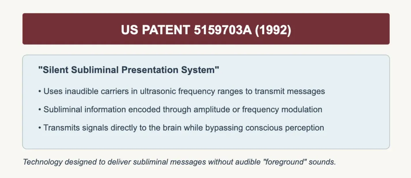US-Patent 5.159.703: System zur stillen unterschwelligen Präsentation. Sendet unhörbare Signale direkt an Ihr Unterbewusstsein – unter Umgehung bewusster Widerstände.