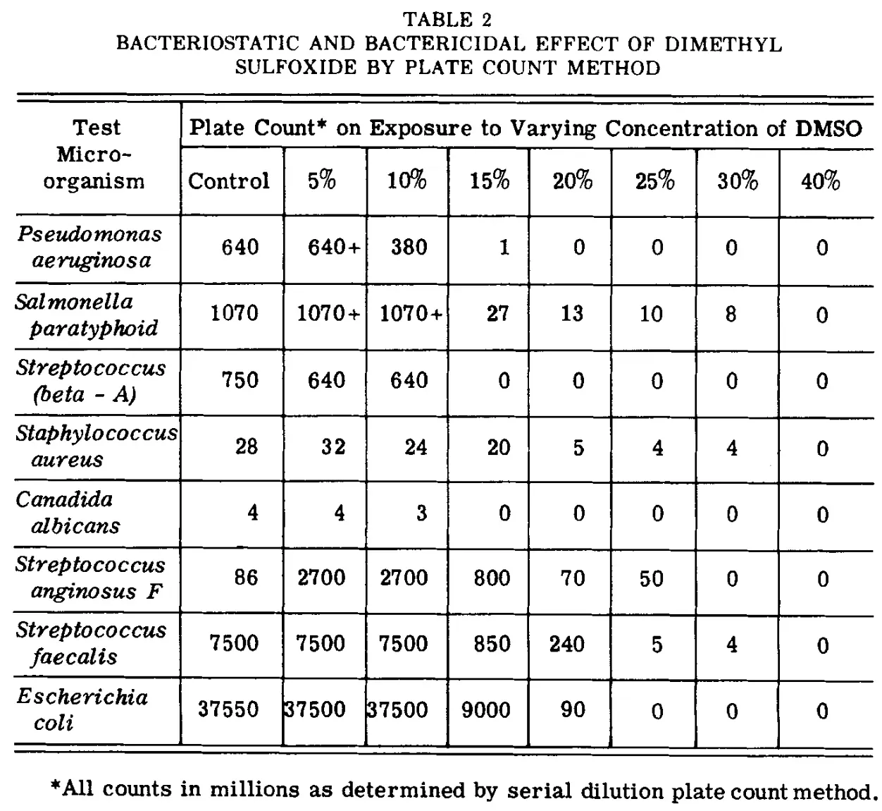 DMSO schädigt Bakterien direkt, kann sie auflösen oder einfach ihren Stoffwechsel stören. Am wichtigsten ist jedoch, dass es ihre Abwehrkräfte beseitigt und resistente Bakterien wieder empfindlich gegenüber Antibiotika macht.