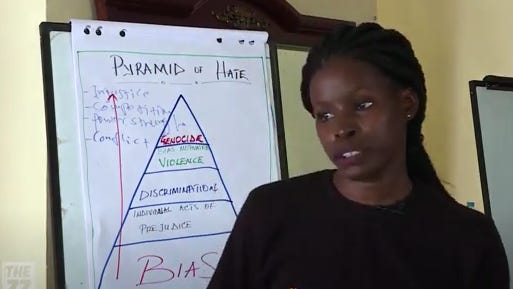 Defy Hate Now wurde angeblich von einer südsudanesischen Feministin und voll und ganz in die Mafia verstrickten NGO-Faktotum namens Marina Modi gegründet. Zu Zeiten der Finanzierung durch das Außenministerium veröffentlichten deutsche Staatsmedien einen kurzen Artikel über ihre Gruppe, was die größte Publicity war, die diese undurchsichtige Geldverschwendungsorganisation jemals erhalten hat. Darin ist zu sehen, wie Modi vor einer Präsentationswand mit einer wild gekritzelten „PYRAMIDE DES HASSES” sitzt und vor der Kamera über „Hass” schwadroniert. Die Pyramide veranschaulicht, wie „VORURTEILE” zu „INDIVIDUELLEN VORURTEILEN” führen, die wiederum „DISKRIMINIERUNG” verursachen, was schließlich zu „(durch Vorurteile motivierter) GEWALT“ führt, die schließlich in einem dunkelvioletten „GENOCIDE“ (Völkermord) gipfeln, der ungeschickt in die Pyramidenspitze gequetscht ist.
