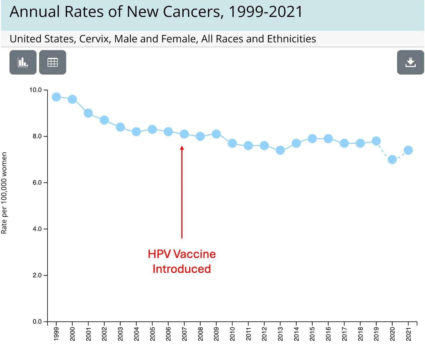 Unterdessen sank die Zahl der Todesfälle durch Gebärmutterhalskrebs aufgrund von Vorsorgeuntersuchungen und Änderungen des Lebensstils weiter, nicht aufgrund des Impfstoffs.
