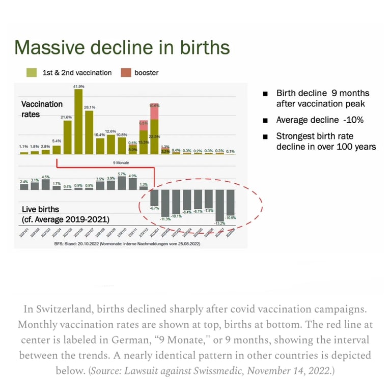 „Seit Januar 2022 ist die Zahl der Lebendgeburten in der Schweiz und im Kanton Bern so stark zurückgegangen wie nie zuvor“, heißt es in einem Dringlichkeitsbericht der kantonalen Gesetzgeber. Eine separate Schweizer Forschungsstudie berichtet unterdessen von einem Rückgang der Geburten im ersten Halbjahr 2022 um 10 Prozent im Vergleich zum vorherigen Dreijahresdurchschnitt. Mithilfe statistischer Modellierung wurde „eine auffällige zeitliche Korrelation zwischen dem Höhepunkt der Erstimpfung und dem Rückgang der Geburten in der Schweiz“ festgestellt.