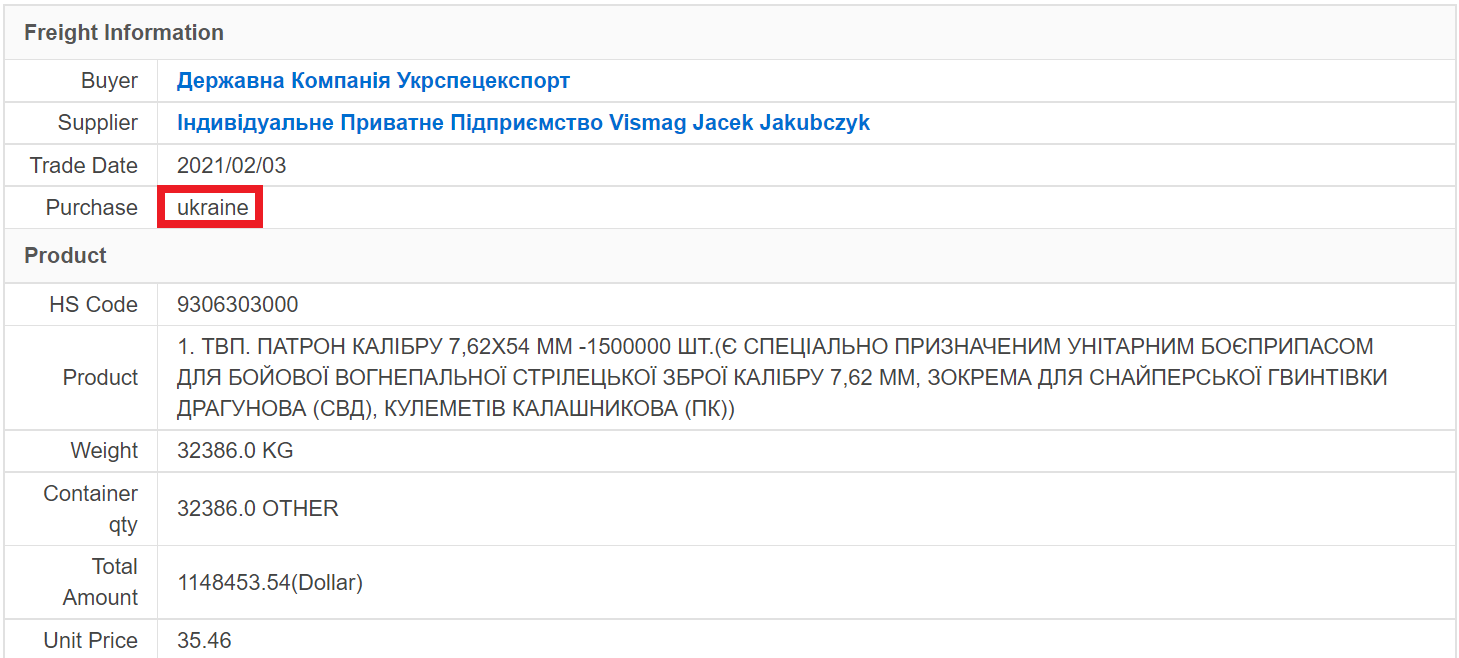 Am selben Tag, dem 3. Februar 2021, kaufte Ukrspetsexport von demselben polnischen Unternehmen Vismag Jacek Jakubczyk 1,5 Millionen Stück 7,62×54 mm-Geschosse: