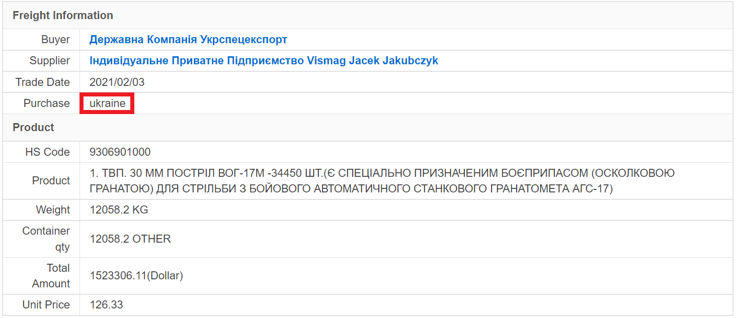 arcus.bgDas ukrainische Staatsunternehmen Ukrspetsexport kaufte 2021 solche 30-mm-VOG-17M-Geschosse (34.450 Stück) von der polnischen Firma Vismag Jacek Jakubczyk, wie aus der internationalen Datenbank Great Export Import hervorgeht.