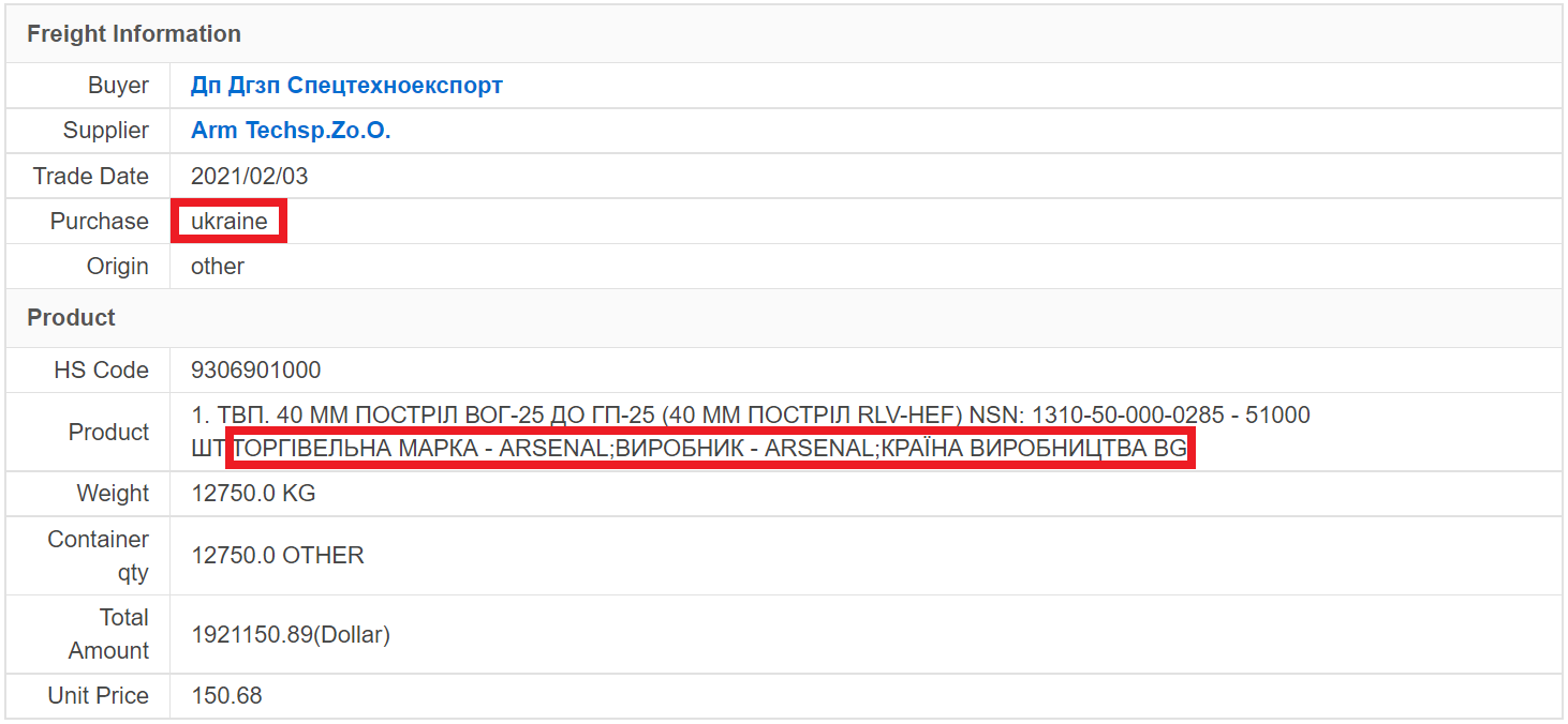 Das ukrainische Unternehmen Dp Dzzp Spetstechnoexport hat in den Jahren 2021, 2020 und 2019 bulgarische Waffen von Arsenal und VMZ-Sopot importiert, und der Export wurde von dem polnischen Unternehmen Arm Techsp. Zo durchgeführt, so die Informationen von Great Export Import. Das ukrainische Unternehmen Dp Dzzp Spetstechnoexport kaufte von Arsenal hergestellte 40-mm-Granaten RLV-HEF für Granatwerfer und von VMZ-Sopot hergestellte 152-mm-Splittergranaten mit hoher Sprengkraft für Haubitzen D-20 und 2C3. In der Datenbank sind elf Einfuhren aus den Jahren 2021, 2020 und 2019 aufgeführt. Als Hersteller der Waffen ist Bulgarien angegeben.