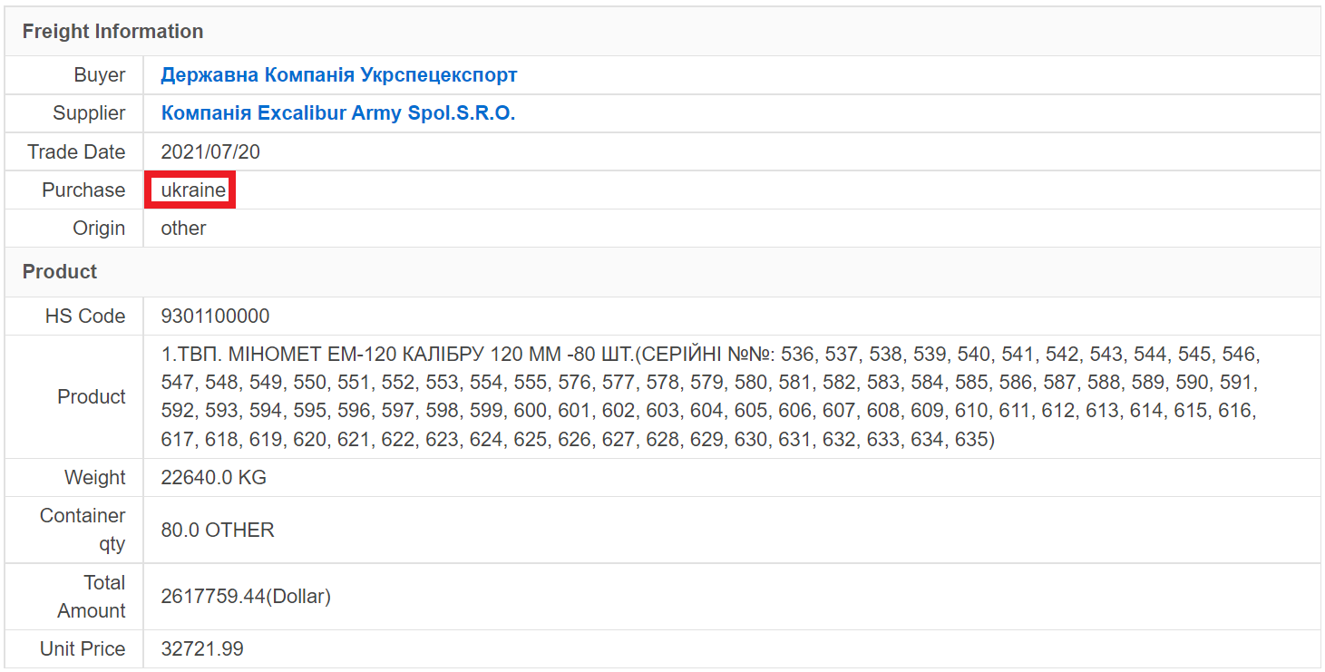 Am 20. Juni 2021 kaufte das ukrainische Staatsunternehmen Ukrspetsexport insgesamt 140 Stück EM-120 Mörser von der tschechischen Firma Excalibur Army Spol.S.R.O., so die internationale Handelsdatenbank Great Import Export. EM-120 wird von der bulgarischen Waffenfabrik Emco hergestellt. Der Eigentümer von Emco, Emilian Gebrev, bestritt, dass sein Unternehmen Waffen in die Ukraine exportiert habe. In den letzten Jahren war er in eine Reihe von internationalen Skandalen verwickelt, darunter seine Vergiftung im Jahr 2015.