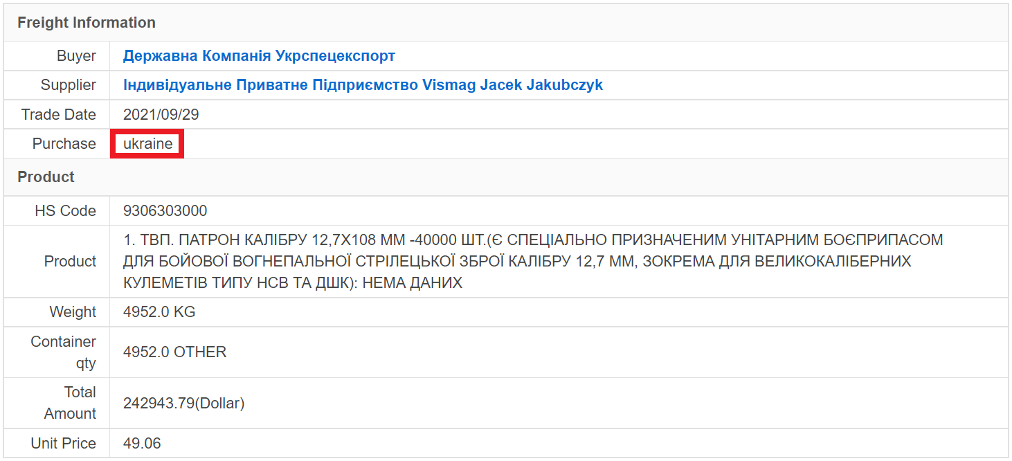 Am 29. September 2021 exportierte das polnische Unternehmen Vismag Jacek Jakubczyk 40.000 Stück 12,7×108 mm Geschosse in die Ukraine.