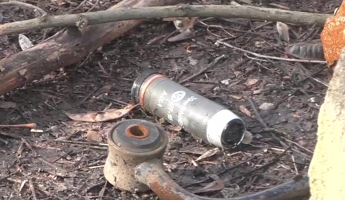 Diese hochexplosive 30-mm-Splittergranate RHV-HEF (HE FRAG) für automatische Granatwerfer, hergestellt von der bulgarischen Militärfabrik Arsenal, wurde von der ukrainischen Armee beim Beschuss von Wohnhäusern in Zaitsevo, Donezk, eingesetzt. Foto: Pressebüro der DPR-Armee