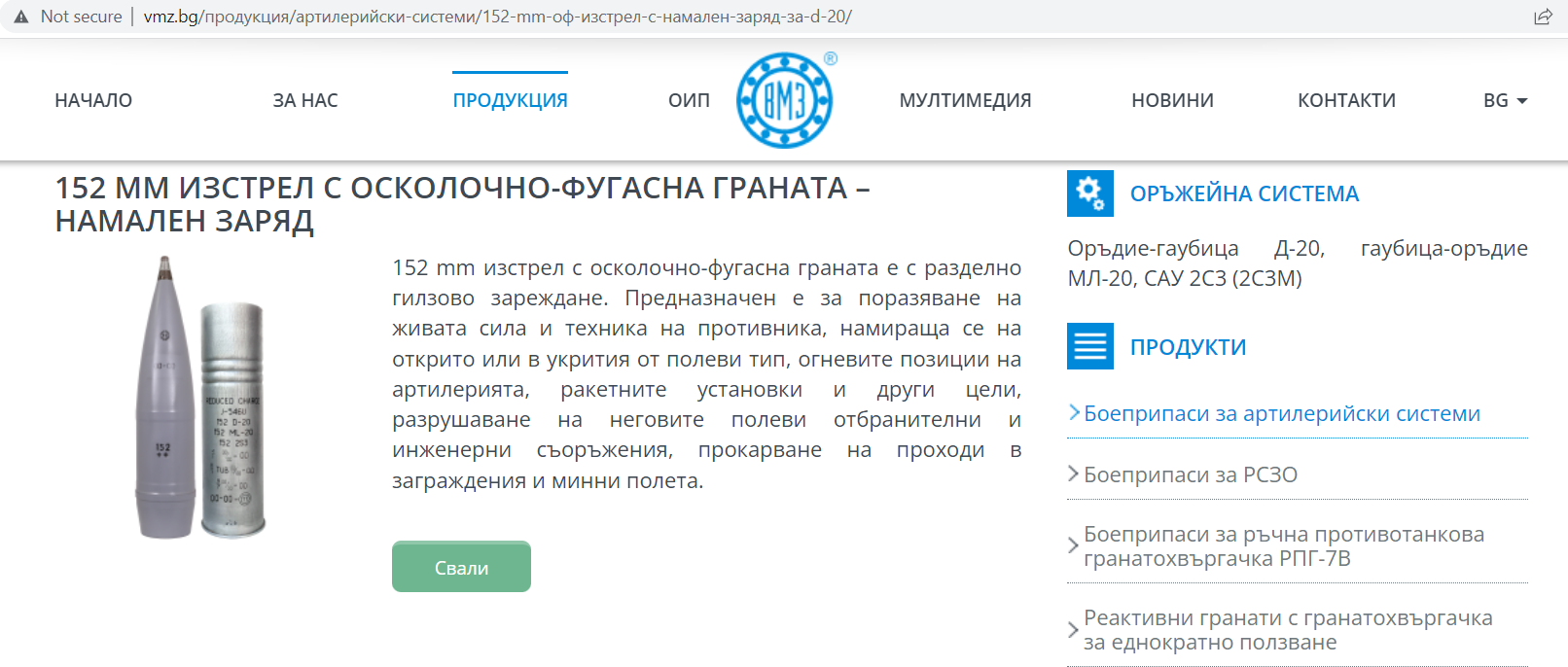 152 mm hochexplosive Splittergranate für Haubitze D-20 und 2C3, Hersteller VMZ-Sopot.Quelle: vmz.bg