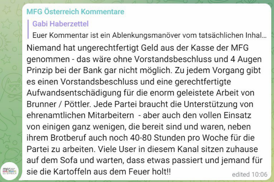 Allerdings. Laut eines MFG Bundesvorstandsmitglieds gibt es für diese Zahlungen an Brunner angeblich gar keinen ordnungsgemäßen Beschluss. Jetzt ist nur die Frage, was ist es, wenn Gelder ausbezahlt werden, ohne ordnungsgemäßen Beschluss? Dabei finde ich die Aussage von Brunner erwähnenswert, wenn er im Interview meint, man hätte ihn fragen können. Das habe ich nämlich gemacht und ich bin dabei nachweislich von ihm und seiner Partnerin belogen worden. Und auf den Wunsch auf Einsicht in die Finanzen erhielt nicht nur ich die Antwort, das geht dich nichts an. Das haben auch einige andere und auch andere Landesvorstände so erfahren müssen.