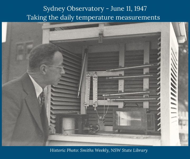 Anbei finden Sie ein Foto aus dem Jahr 1947 vom Sydney Observatory, das die Thermometer zeigt, die offiziell die Temperaturen in Sydney aufzeichneten und in einer traditionellen „großen“ Wetterhütte untergebracht waren – mit einem Innenvolumen von etwa 0,23 m³. Das BOM hat die Größe der Wetterhütten verkleinert und das Innenvolumen auf nur noch 0,06 m³ reduziert – eine Verringerung um 74 %. Um wie viel höher werden die gemessenen Temperaturen an einem heißen und windstillen Tag in dem kleineren Schirm sein, wenn die Hütten auf diese Weise verkleinert werden?