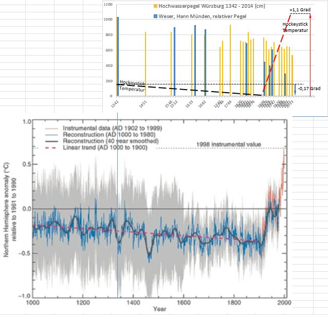 Bild 23 Verlauf Globaltemperatur Hockeystick und Hochwasserpegel Main und Weser (Verlauf Weser relativ zum Main) von 1342 bis 2013. Grafik vom Autor erstellt