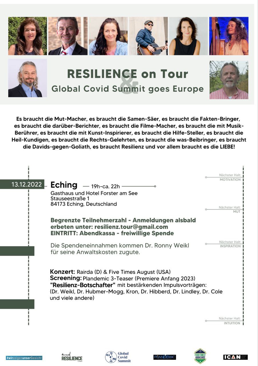 Die Resilienz-Tour umfasst insgesamt fünf Termine: Einer davon findet im bayerischen Eching statt, die übrigen in Österreich. An allen wird die Musik eine besondere Rolle spielen: Großartige Musiker der Bewegung sorgen für ein besinnliches Beisammensein. Dr. Maria Hubmer-Mogg von #wirzeigenunserGesicht stimmt auf die Tour ein: