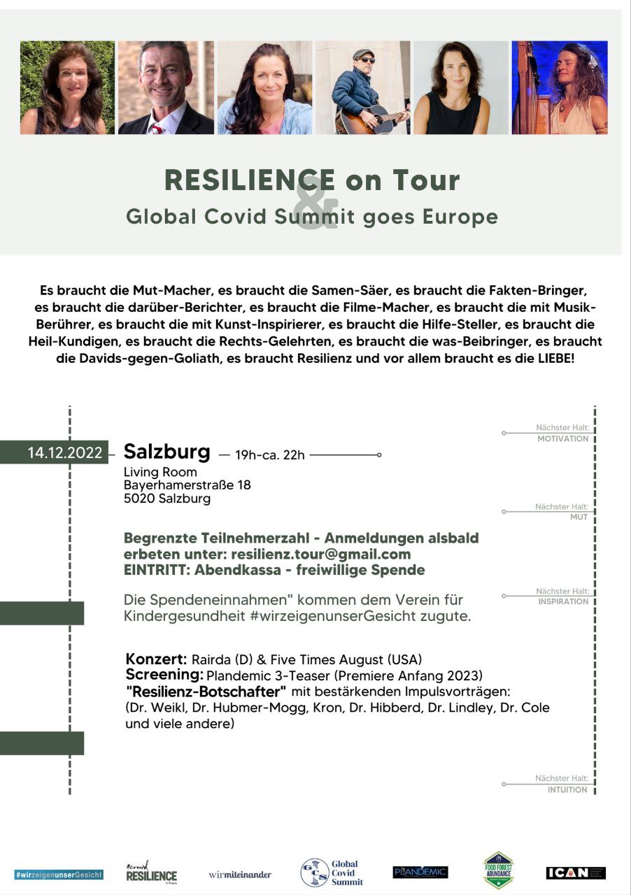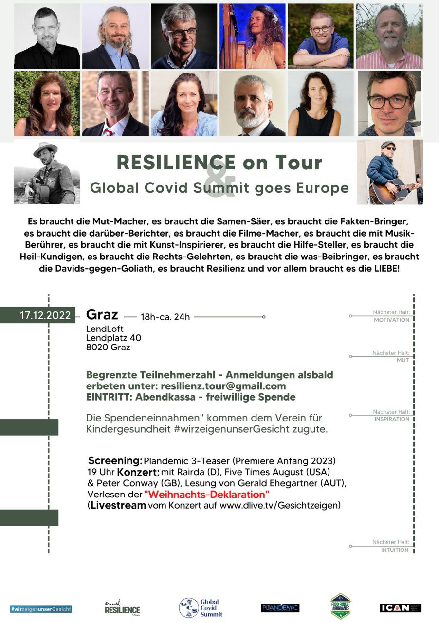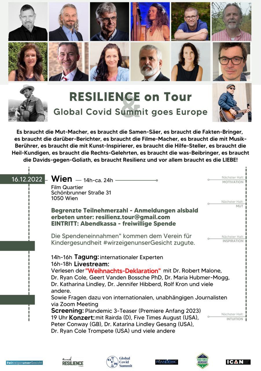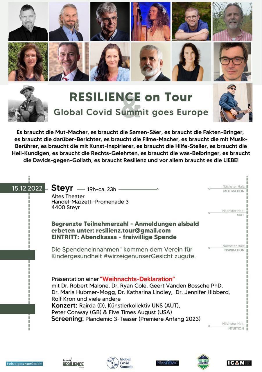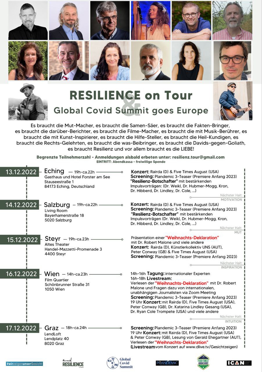 Nach dem großen Erfolg der Better Way-Konferenz in Wien, die internationale Größen des Widerstands nach Österreich brachte, findet im Dezember eine neue Veranstaltungsreihe statt, die nach bald drei Jahren Gesundheitsdiktatur Hoffnung und Mut für die Zukunft macht. Die “Resilienz-Tour” wird Aktivismus mit Besinnlichkeit und Musik verbinden. Das Programm umfasst je nach Termin spannende Vorträge, Lesungen und die Verlesung einer Weihnachtsdeklaration durch namhafte Experten wie Dr. Robert Malone, Dr. Ryan Cole und Prof. Geert Vanden Bossche. Konzerte sorgen für die perfekte vorweihnachtliche Stimmung.