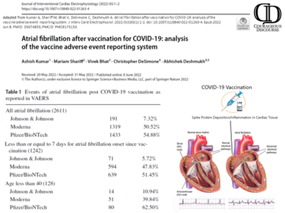 [ii] Kumar A, Shariff M, Bhat V, DeSimone C, Deshmukh A. Atrial fibrillation after vaccination for COVID-19: analysis of the vaccine adverse event reporting system. J Interv Card Electrophysiol. 2022 Oct;65(1):1-2. doi: 10.1007/s10840-022-01263-4. Epub 2022 Jun 8. PMID: 35674855; PMCID: PMC9175153.