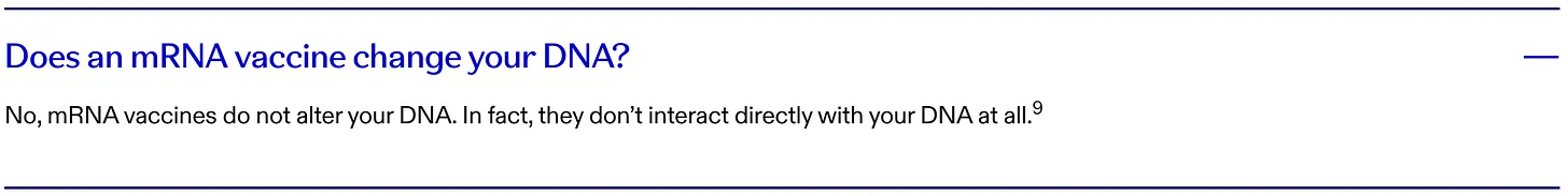 Pfizer behauptet daraufhin – mit absoluter Sicherheit – dass mRNA-Injektionen keinerlei Wechselwirkung mit der menschlichen DNA haben. Man würde also erwarten, dass eine solche Aussage in der zugehörigen Fußnote Nr. 9 mit einer fundierten und thematisch passenden Studie belegt wird.