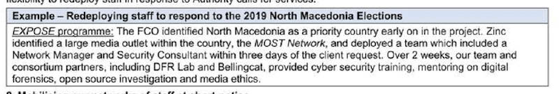 Die Projekte des britischen Außenministeriums wurden verdeckt und in Zusammenarbeit mit angeblich unabhängigen, hochrangigen Online-Medienunternehmen wie Bellingcat, Meduza und dem von Pussy Riot gegründeten Mediazona durchgeführt. Die Beteiligung von Bellingcat umfasste offenbar auch eine Intervention des britischen Außenministeriums bei den Wahlen in Nordmazedonien 2019, zu Gunsten des Pro-NATO-Kandidaten.