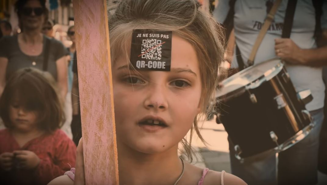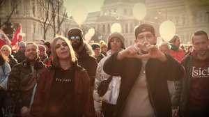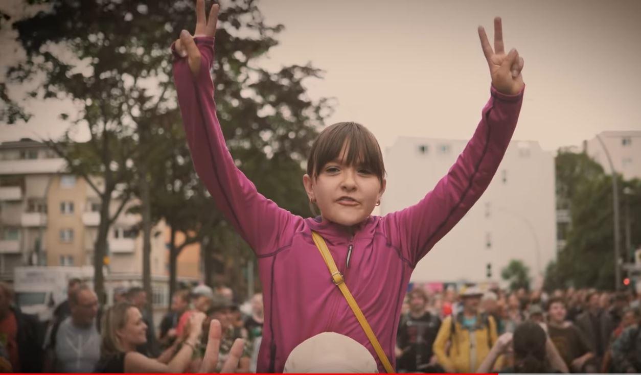 „Kleine Kinder haben stundenlang eine Maske auf“, rappt Äon und geht auf die psychischen Schäden ein, die die Maßnahmen bei Kindern hinterlassen, um aufzufordern: „Macht die Augen auf, dieser Wahnsinn muss endlich enden.” Daraufhin sieht man im Video ein kleines Mädchen auf den Schultern (wahrscheinlich) ihres Vaters sitzen, das ebenfalls „Friede, Freiheit” ruft, gefolgt von einem “Keine Diktatur“ der Masse.