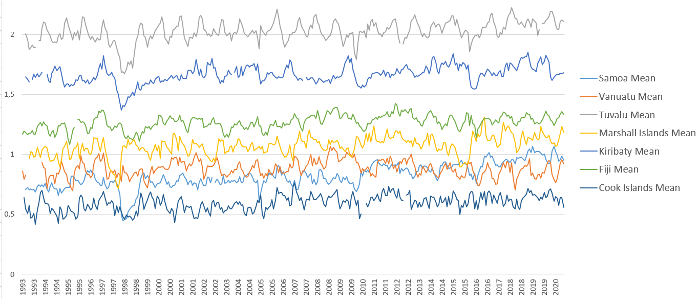 Zusammengefasst wurde diese erste Sichtung (ein weiteres Kapitel mit einer zweiten folgt) anhand der Pegeldaten der Inselgruppen: Cook Islands; Fiji; Kiribaty; Marshall Islands; Tuvalu; Vanuatu; Samoa