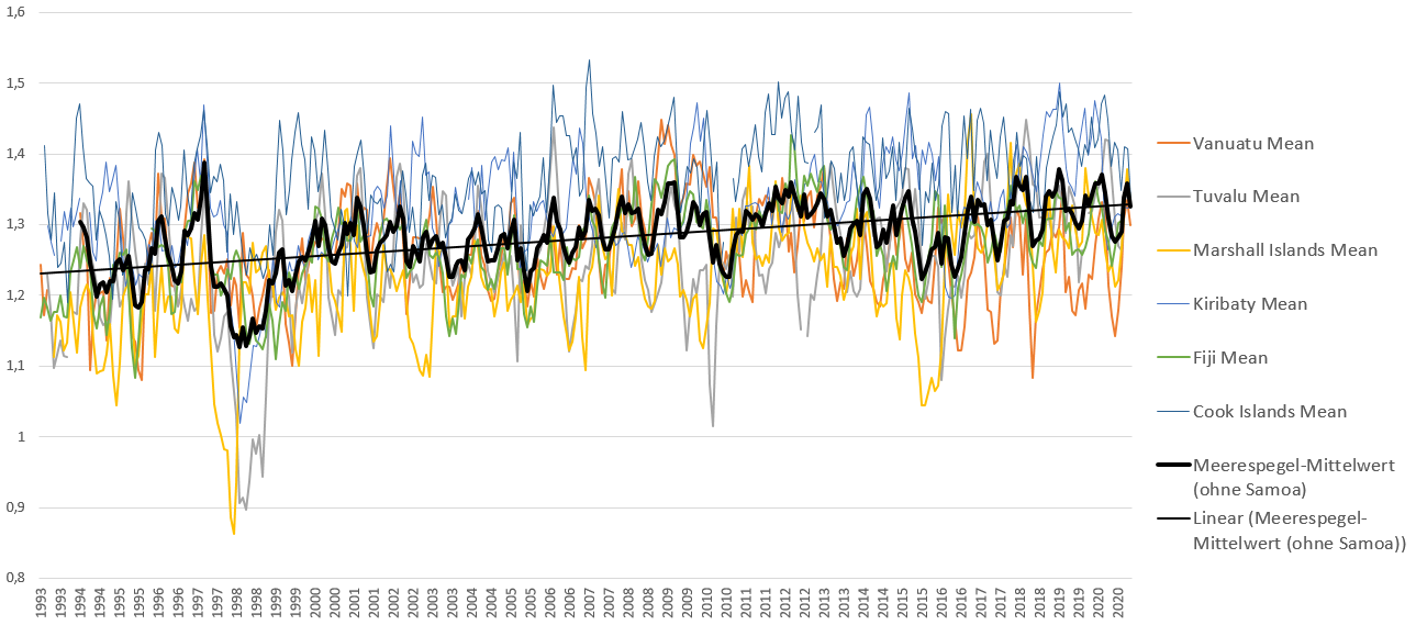 Alle Südseeatolle liegen auf einer seismisch hoch aktiven Bruchkannte (Pazifischer Feuerring). Ein latentes, regelmäßig sich wiederholendes Problem sind dort Erdbeben mit als Folge auch vertikalen Landbewegungen. Und Samoa wurde durch solche seit 1993 um ca. 25 cm „gesenkt“, also weit, weit mehr, als der Meerespegel seitdem anstieg.