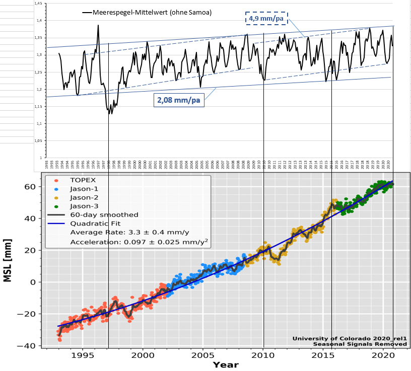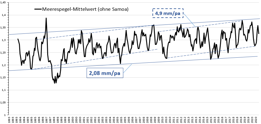 Bild 6 Pegeldaten Samoa und Teil-Mittelwert des Australischen Pazifik-Monitoringprogrammes (Datenauszug 6 Atolle) von 1993 – 2019. Grafik vom Autor erstellt