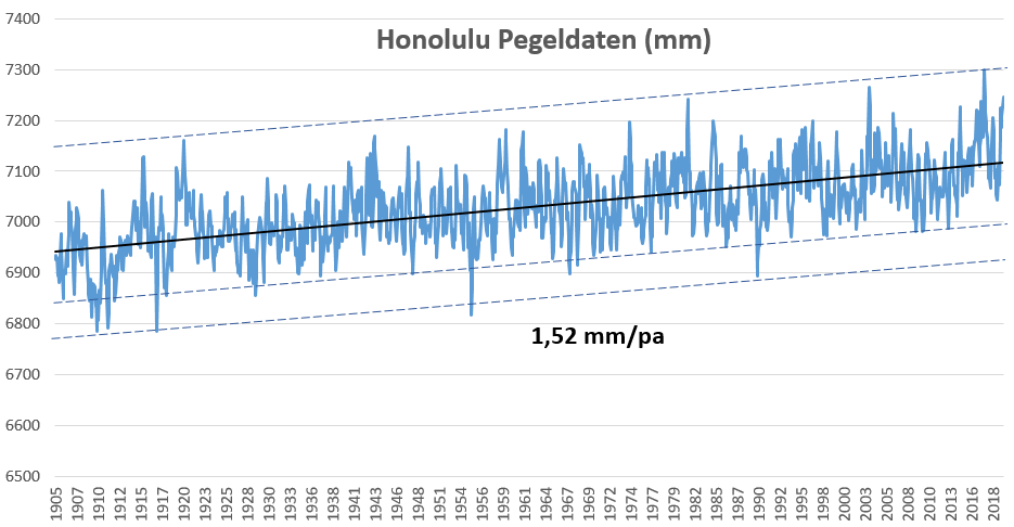 Bild 8 Pegelverlauf Honolulu von 1905 – 2019. Datenquelle: PSMSL. Grafik vom Autor erstellt