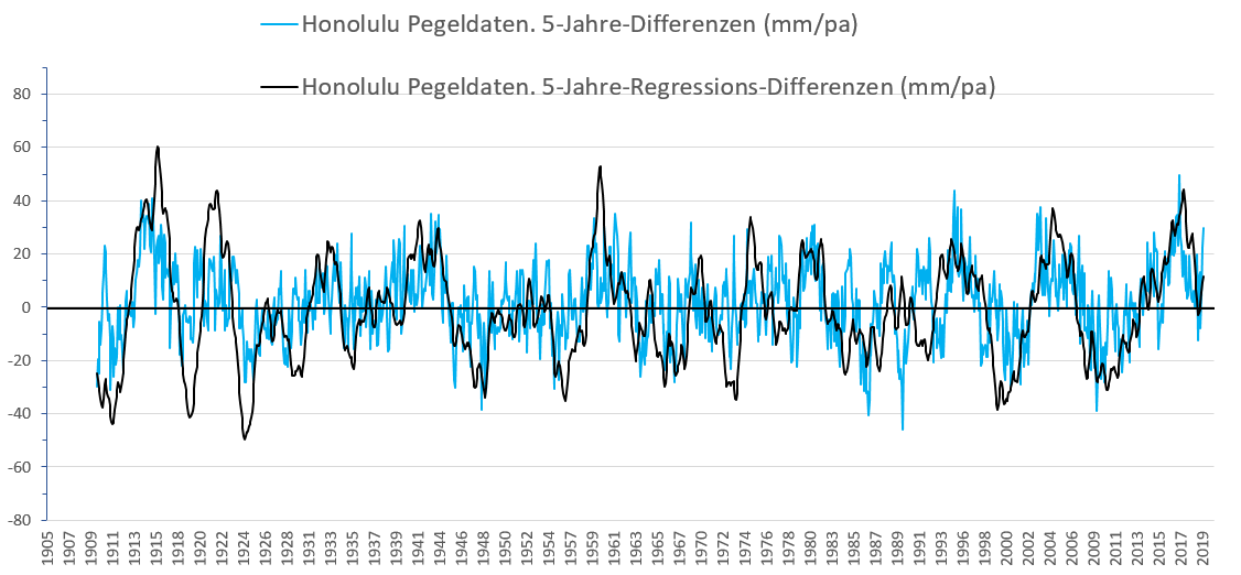 Bild 9 Honolulu. Pegel-Änderungsrate (Residuals) der 5Jahre-Zeitspanne als Absolutwerte und als Steigungswerte der Regessionsgeraden von 1905 – 2019. Datenquelle: PSMSL. Grafik vom Autor erstellt