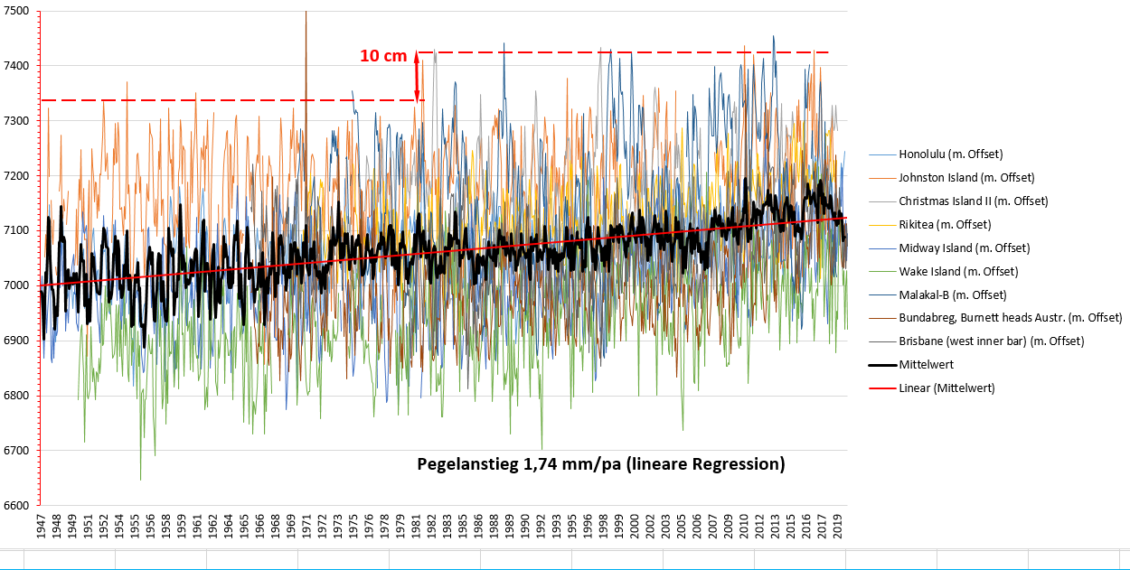 Als Abschluss zur Darstellung der „Bedrohungslage“ im Pazifikraum durch den Pegelanstieg das folgende Pegelbild. Vergleichend muss man dazu berücksichtigen, dass die seit Jahrtausenden sich jährlich wiederholenden Hurricans Flutwellen von 3 … 5 m Höhe erzeugen (neben den zusätzlich erscheinenden, ebenfalls recht regelmäßigen Tsunamis).