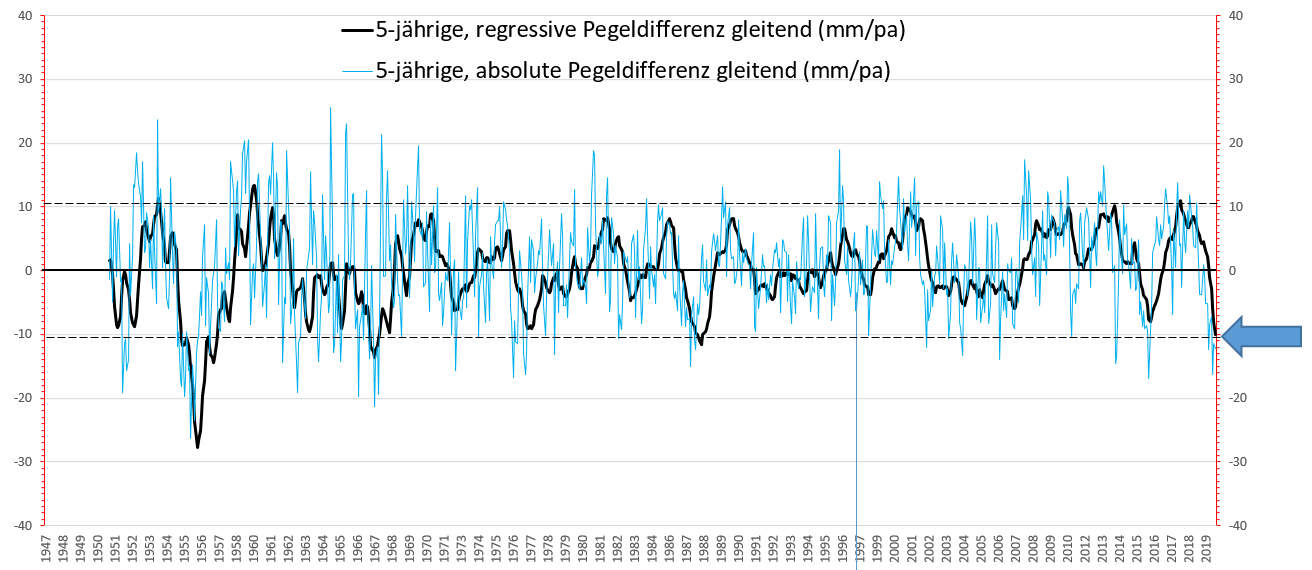 Die von Herrn Prof. Rahmstorf gemeldete, schlimme Pegelanstiegsrate von 4,8 mm/pa gibt es auch in dieser Gegend ab und zu, allerdings mit sich in Summe auf Null ausmittelndem Gesamtwert.