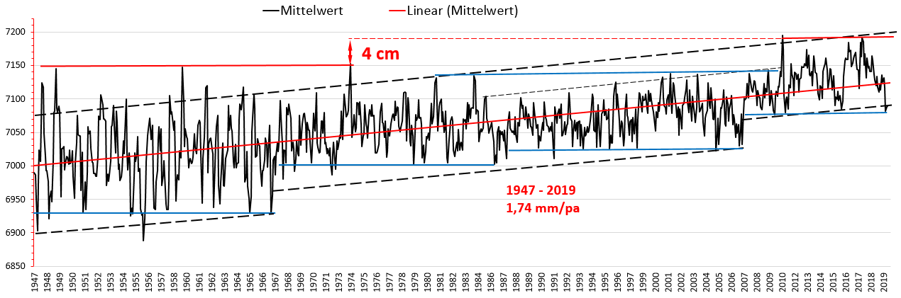 Eine grobe Analyse dieses Pegelverlaufs zeigt das folgende Bild. Es zeigt, dass die über den gesamten Zeitraum gelegte Regressionsgerade einen zu hohen Wert liefert. Der wirkliche Pegeltrend ergibt sich aus den Einhüllenden. Und danach wäre der Tiden-Pegelanstieg in dieser (angeblich) besonders schlimm vom Meerespegelanstieg betroffenen Region nur ca. ca. 2,1 mm/pa, bis zum Jahr 2100 also noch +16,80 cm zusätzlicher Pegel (und meilenweit entfernt von den im Bild 1 durch die Einfärbung angegebenen Pegel-Steigungsraten).