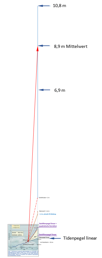 Dem STEN-Artikel gegenüber ist Herr Prof. Rahmstorf mit „seinem“ Pegelanstieg wirklich noch moderat. Ein Kollege von ihm im PIK macht das aber wieder wett. Prof. Levermann hält in einer Studie mit seiner Beteiligung „denkbare“ 8,9 m Pegelanstieg bis zum Jahr 2100 für möglich (das wären ab sofort ca. 100 mm/pa nötiger Pegelanstieg):